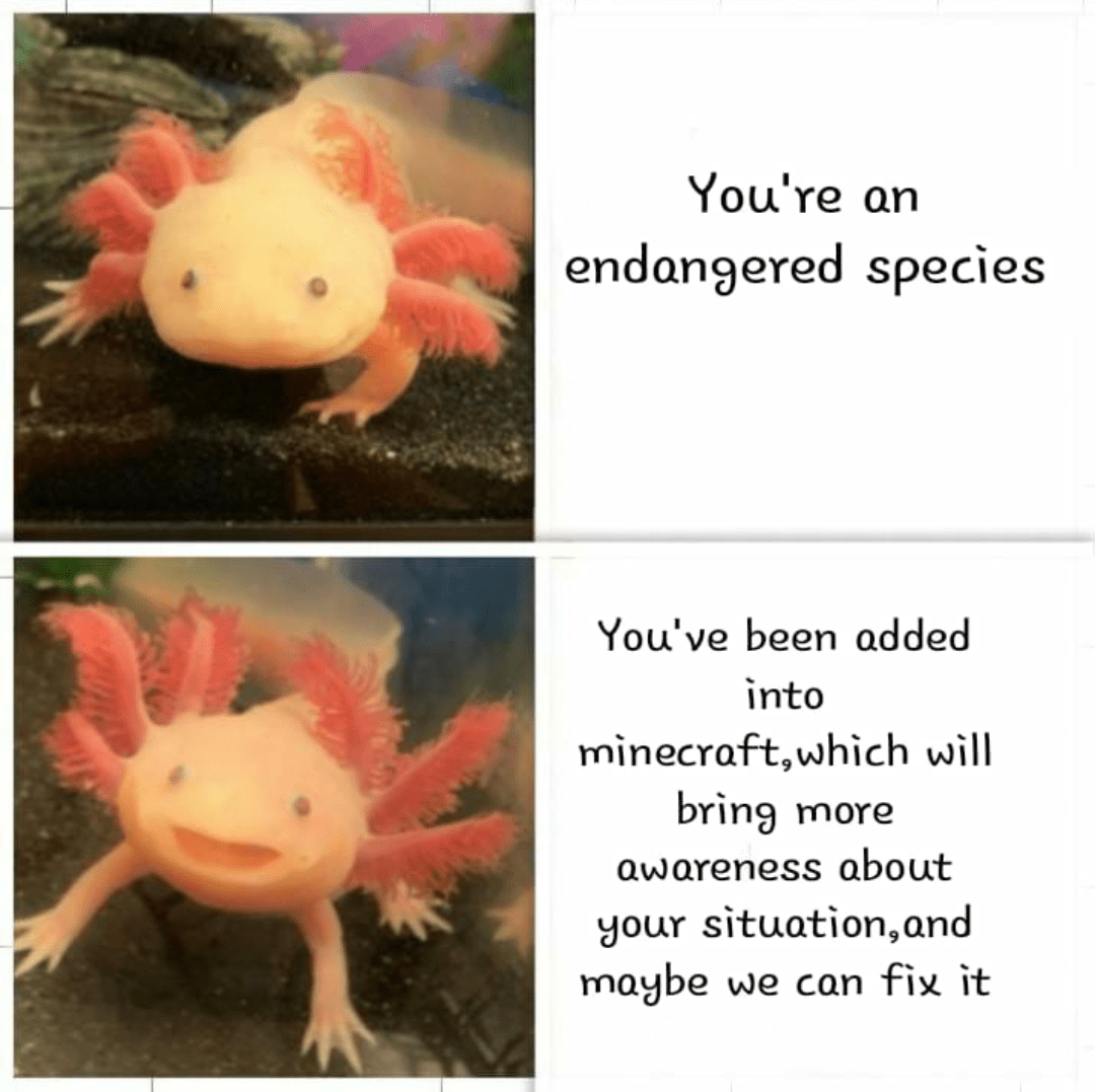 Axolotls are cute but will probably kill everything anyway. But hey - we're getting an update to caves! Minecraft Live 2020: - Recap: - MinecraftMemes reddit: - Merch: - -------------------------------------------------------------------- This channel is powered by Shockbyte server hosting -- Receive a 10% discount on your first month on a Server with the code "PHOENIXSC"! Link: - -------------------------------------------------------------------- If you enjoyed watching, consider dropping a LIKE or even SUBSCRIBE! If you'd like to monetarily support the channel, consider joining as a loyalty member! - SECOND CHANNEL: - TWITTER: - TWITCH: - WEBSITE: - DONATE: - FACEBOOK: - #Minecraft is a game about breaking and placing blocks, developed by Mojang. That is all. Minecraft: - Outro music: Silent Partner - Sad Past #PhoenixSC #Memes